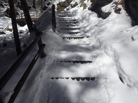 歩道は朝晩の温度差により、凍結しているので十分注意して登ってください。