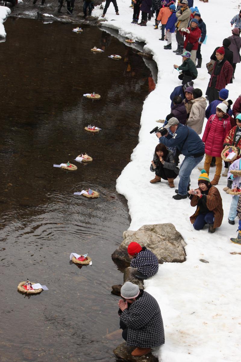 3月3日、役場前の相木川で、小学校児童による恒例の家難祓(かなんばれ)が行われました。この日はマイナス8度近くまで冷え込みとても寒い朝になりましたが、地元の方や写真愛好家、報道関係者など大勢の方々が集まり、子ども達は多くの人に見まもられながら、災いが取り払われるようにお雛様に念じて流していました。