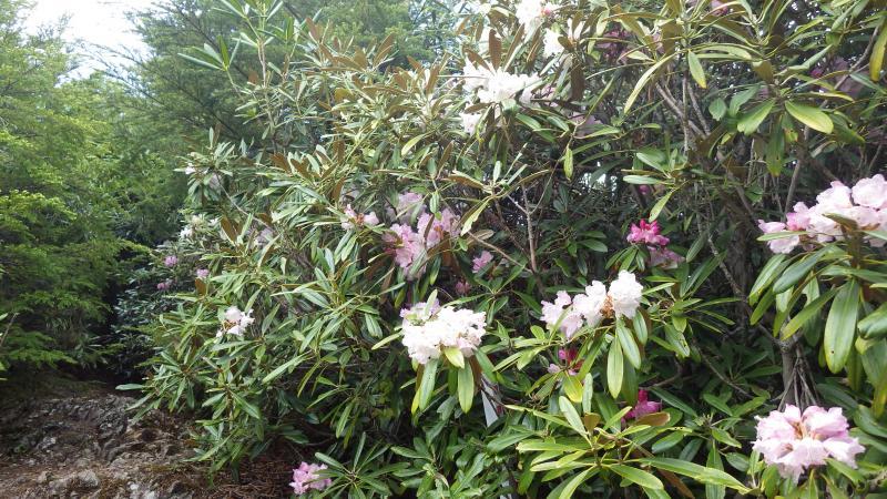 見晴台(標高1800メートル付近)では来週ぐらいまでシャクナゲを楽しむことが出来ると思います。前衛峰(標高2000メートル付近)から山頂までは蕾の場所もあったため、来週以降にシャクナゲが咲く場所もあると思います。山頂の日当たりが良いところでは満開でした。